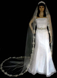 1st Class Bridal | FC Bridal 108 Inches - Pewter Thread Floral And Leaves Cathedral With Metallic Silver Wire Outline Embroidery With Rhinestone Accents.