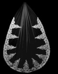 Description: 108x72 - Luxurious peacock design accented with rhinestones and clear sequins. Finished edge. Alencon lace. 17.5” lace height. 30” comb to lace. Amaze your groom with fanciful, breathtaking beauty!