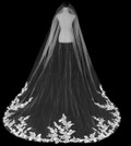 Description: 120x90 - French alencon lace, floral design, accented with rhinestones & clear sequins. Lace peak: 26”. This cathedral drapes very well going down the aisle.