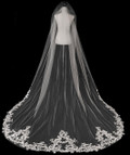 Description: 120x90 - French alencon lace Royal veil accented with rhinestones & sequins. Finished edge. Grab this beautiful veil today at an affordable price!