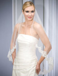 Description: Veil only. Unite your perfect lace or floral dress with its sister Alençon lace veil! Lavish flowers grace along the bottom edge of this 1-tier, fingertip length creation to provide stylish embellishment lace.