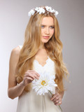Take it back to the 1960's over the forehead hippie style headpiece or worn farther back as a floral crown for a romantic & whimsical woodland wedding or look. This halo wreath is handmade in the USA and is available with White or Ivory Silk Flowers.