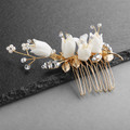 Description: Unique ivory resin tulip-shaped flower buds with etched gold leaves, baby pearls and crystals sprays combine to create this hand-crafted Mariell exclusive wedding comb. Our gold-plated bridal hair comb with its jewel-encrusted petals and boho floral motif is an affordable work-of-art!