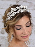 Mariell's exclusive bohemian-inspired bridal tiara headband features a stunning split band design. It's convertible silhouette can be worn with the bands pressed together for a traditional tiara shape or wear with the floral band pulled open to create a double tiered tiara or a split headband. A bountiful array of light cream resin flowers, dainty silver petals, hand painted matte silver leaves arer accented with ivory pearl sprays in inlaid crystals. This stunning silver bridal headpiece is hand-wired to a flexible silver band with loops at each end to secure with bobbi pins, if desired. Floral motif measures 8 ½" wide x 1 ¾" high