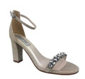 Camila is a 2.75 inch sandal made from a great champagne shimmer material that features a manmade sole and jeweled ornament on the vamp.