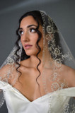 The Elena Designs Cathedral Bridal Veil E1406 - Beaded Mantilla - 130L is a stunning display of elegance, featuring a delicate beaded vine motif that gracefully winds its way down the length of the veil. With a generous 130" length and 108" width, this veil creates a dramatic, cascading effect that beautifully complements any bridal gown. The intricate beaded vine design adds just the right amount of shimmer and texture, catching the light as you move and creating a captivating, ethereal look.