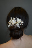Description: Elena Designs E321 - Gold Crystal Flower Hair Clip - Jeweled Hair Accessory. Float down the aisle with cloud nine bliss. Shimmering and lustrous complete this heart-fluttering accessory.