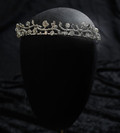 A-5672 - 1” high delicate tiara of rhinestone chain, rhinestone flowers, MOP flowers & silver leaves….