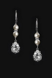 Description: Erica Koesler Earring J-9395 - Pearl & Crystal Earring. 2 ½” hanging earring of pearl & crystal with a large teardrop rhinestone drop on a rhinestone accented French hook. *Silver Only