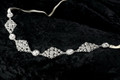 Description: Four elongated rhinestone filigrees spaced with faceted rhinestones on a velvet ribbon. Diamond white, Ivory or White ribbon