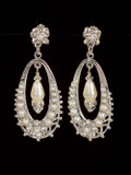 Description: 2" long post earrings of oval filigree trimmed with pearl chain and a center hanging teardrop pearl. White or Ivory pearl