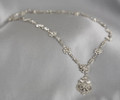 Description: 18" necklace of rhinestone bars & rhinestone flowers graduating in size w/ a hanging filigree pendant trimmed with set rhinestones.