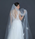 Description: 100″ (108″) flutter cut veil scattered with hand embroidered floral appliqués throughout, accented with pearls, seed beads & lochrosens on a silver comb. (Diamond white, ivory or white )