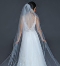 Description: 110″ (108″) cut edge veil with scattered 4mm tri pearls on a silver comb…. (Ivory or white pearls)