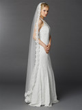 Dramatic 1-Layer Floor Length (72") Mantilla wedding veil has an exquisite scalloped embroidered lace edge with scattered pearls and sequins. Our best-selling Chapel length veil!  Our veil is accented by scattered pearls and sequins and includes a sewn in comb. This breathtaking white veil is also offered in a beautiful Ivory.