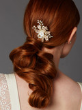Description: Slide this pave crystal freshwater pearl bridal hair comb into any updo to add a golden glow to your wedding hairstyle. Mariell's hand-wired wedding comb with lustrous freshwater pearl sprays is a romantic headpiece with a floral touch. 3 1/2 w x 2 5/8" h.