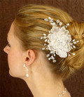 Description: Lavish comb of silver thread edged tulle flowers adorned with wired Austrian rhinestones, crystal beads and silver bugle beads.