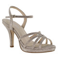 Mae is an incredibly comfortable, stylish 3.25 inch strappy sandal available in medium and wide widths. The high end shimmer material provides just the right amount of sparkle while the synthetic sole offers superior cushion and traction all night long.