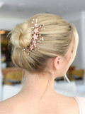 Description: With a bevy of rose gold leaves adorned with baby pearls and accented with fiery Austrian crystal rhinestone sprays, this bridal comb is the perfect addition. This bohoemian style rose gold headpiece is meticulously hand wired to add glam to any wedding or special occasion hairstyle.