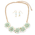 Description: Clusters of petals in Cream Pearl mixed with Pastel Mint make this an irresistible necklace set for proms, beach weddings and any event calling for exotic jewelry. The necklace is adj. 16" - 21" and each flower is 1 1/4" round. Drop earrings are 1 7/8" h.