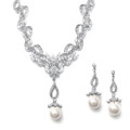 Description: Mariell's magnificent bridal necklace and earrings set has a shimmering pave ribbon design featuring inlaid CZ's and soft creme pearl drops.