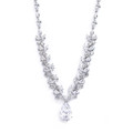 Description: All eyes are on you as you enter the room in this breathtaking 16" bridal necklace with a dazzling 1" pear shaped drop. Cubic Zirconia go fully around our necklace for the look of genuine diamonds. The Rhodium plating tops it off with the look of Platinum.