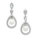 These Mariell clip-on earrings feature CZ clusters with a unique pavé caged pearl drop for a contemporary wedding or special occasion look. Plated in rich silver rhodium, these earrings measure 1 3/4" h with a soft creme pearl