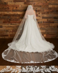 Style: Marionat Bridal Cathedral Veil 3944 - 120” Long - Tapered to 74” at top. Leaf and floral lace edge with appliques, sequins and pearls.