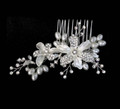 Description: Hand wired floral hair comb with orchid design and floating rhinestone, pearl - Waltz your way down the aisle wearing this glittering hair comb! This comb creates a lovely accent for your bridal ensemble.