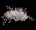 Description: Hand wired hair comb with chiffon bubble flower and floating rhinestone, pearl accent - Waltz your way down the aisle wearing this glittering hair comb! This comb creates a lovely accent for your bridal ensemble.