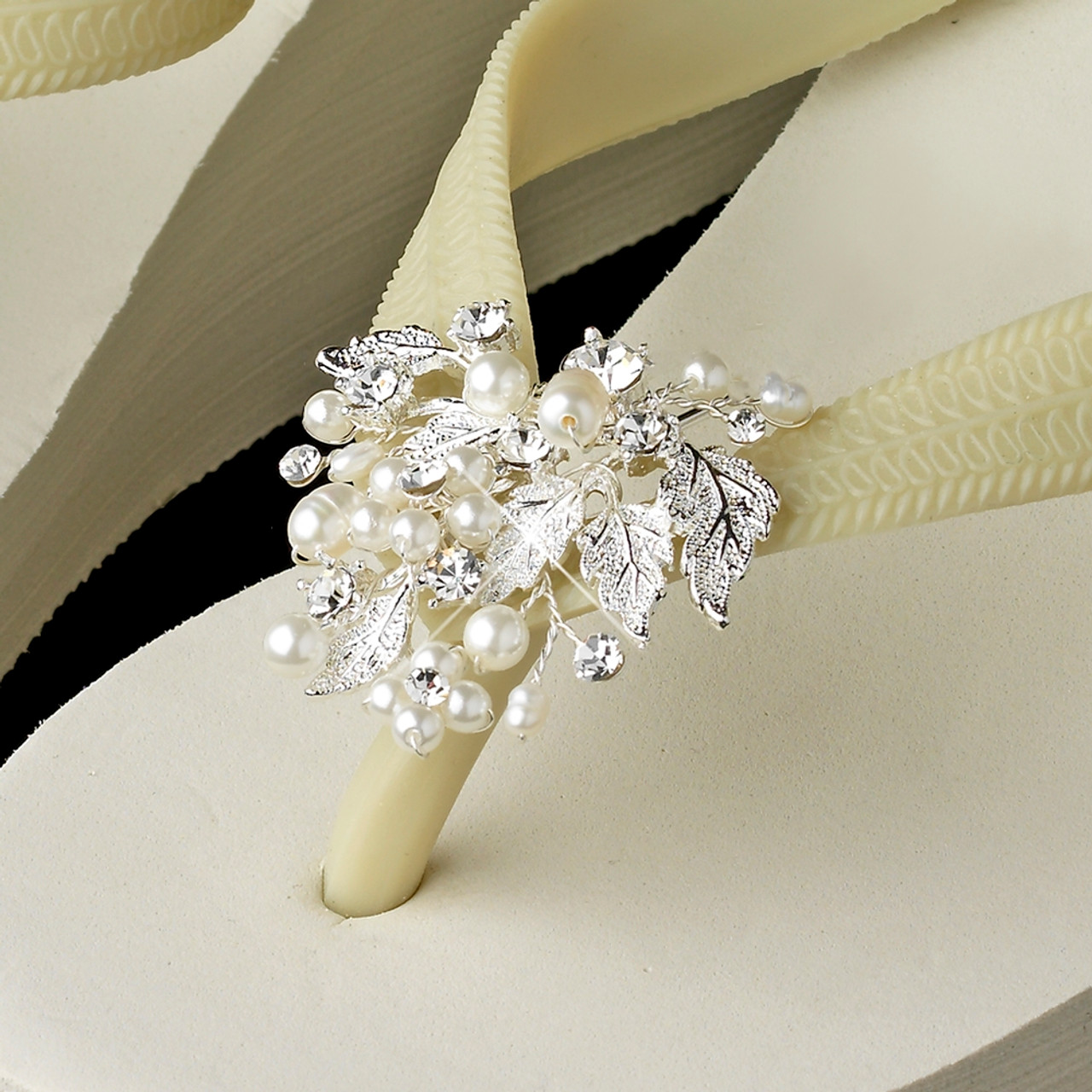 Charming Rhinestone & Pearl Leaf Accents High Wedge Flip Flops This dazzling and very popular Bridal Flip Flop is the perfect accent to anyone looking for a comfortable yet trendy alternative to wedding shoes. Whether worn to a destination wedding or an elegant event, you'll have happy feet!