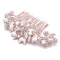 Description: Rose Gold Wedding or Prom Comb has clusters of sparkling crystal flowers and a sunburst of lucite marquis stones in the center accented by hand-wired Ivory pearls. This 4 1/4" w X 2 1/2" h Bridal Comb is plated in Genuine 14K Rose Gold for a lovely vintage touch.