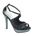 Description:  Sonya is a sexy platform sandal with AB stones and a 4" heel covered in black iridescent material. Contrasting the heel is a black satin material that covers the rest of this style while featuring straps with a buckle for support.