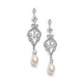 Mariell's best selling vintage earrings feature pave CZ's and a freshwater pearl drop plated in antique silver rhodium. These impressive bridal earrings are 2 1/4" h and 5/8" w.