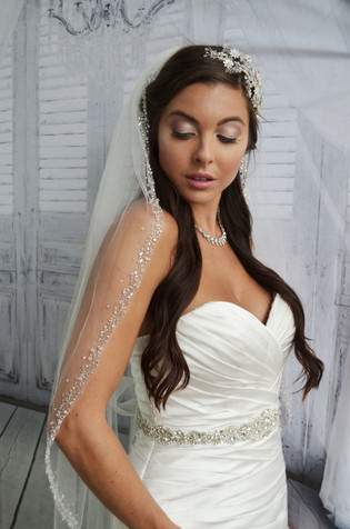 Description: Ansonia Bridal Veils & Accessories 739 - Glitter Shimmer Tulle One tier beaded edge veil with bugle bead ,pearl, rhinestone & crystals. Available in Fingertip & Cathedral length